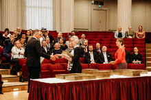 Walter Ehrströmin säätiön hallitus myönsi väistyvälle puheenjohtajalle Jaana Husu-Kalliolle (keskellä) kultaisen ansiomitalin 4.11.2024. Kuvassa vasemmalta asiamies Virpi Piirainen sekä hallituksen jäsenet Suvi Taponen, Johanes Ijas, Hanna Laitinen, Johanna Björkroth, Riikka Åberg, Mats Nylund ja Marjukka Mattio.